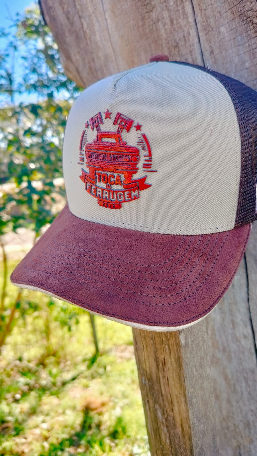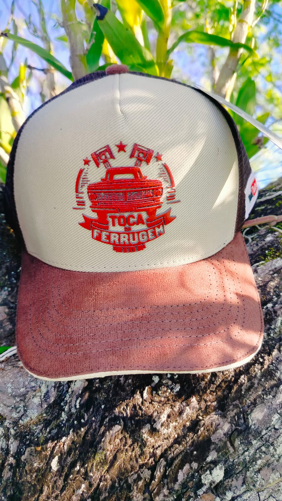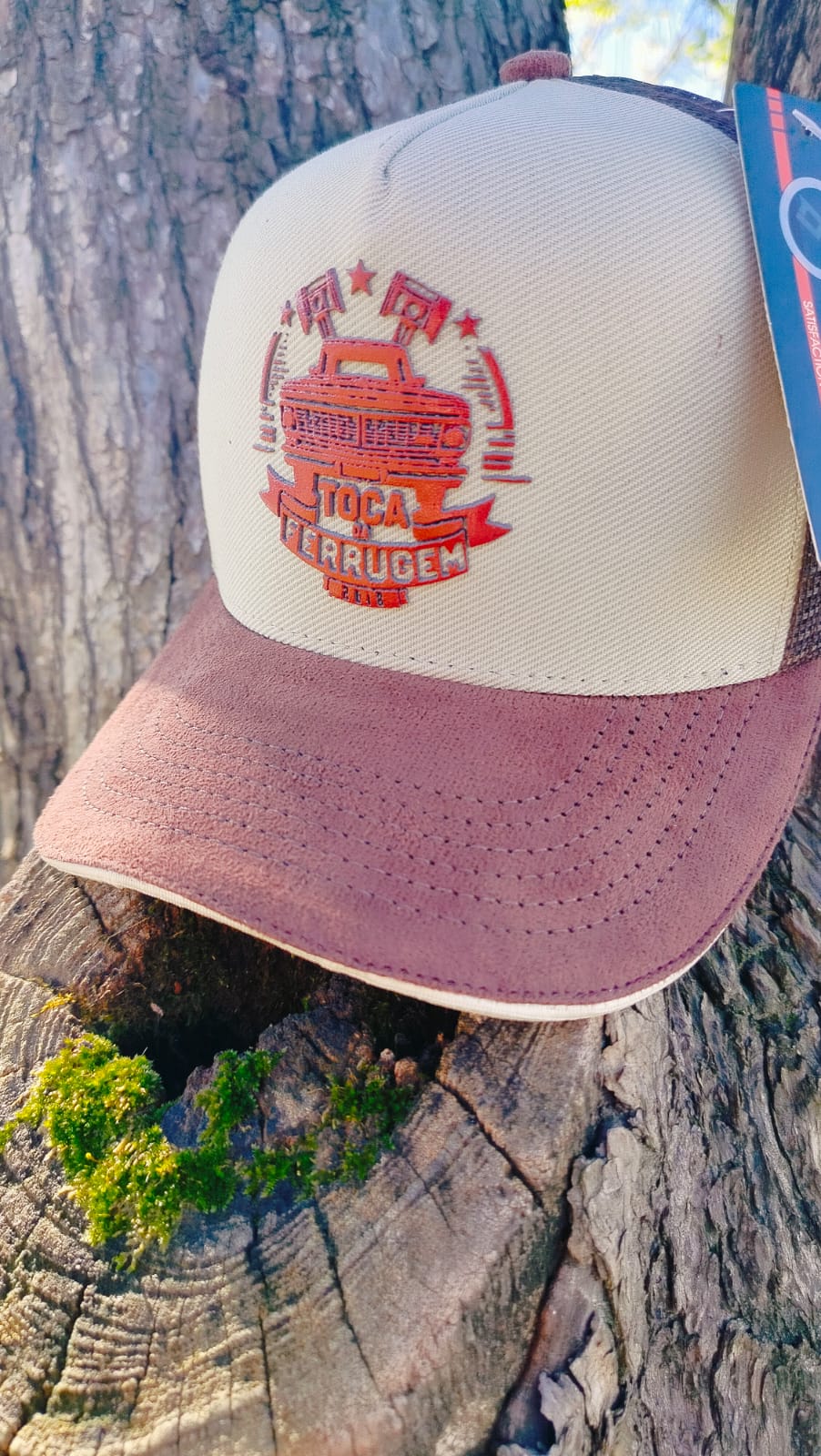 Olha que lindo esse boné da Toca da ferrugem com detalhes em couro e camurça.