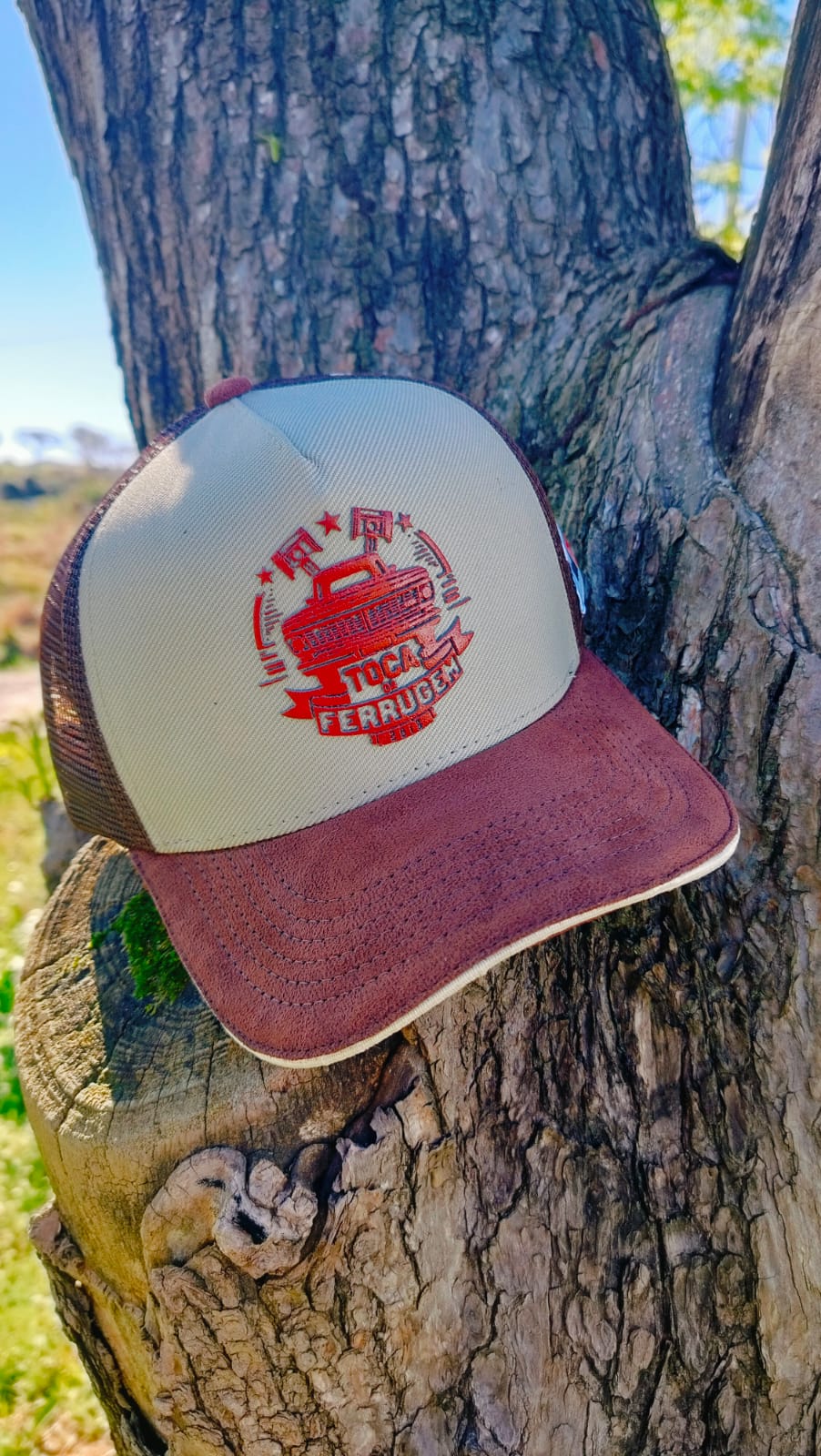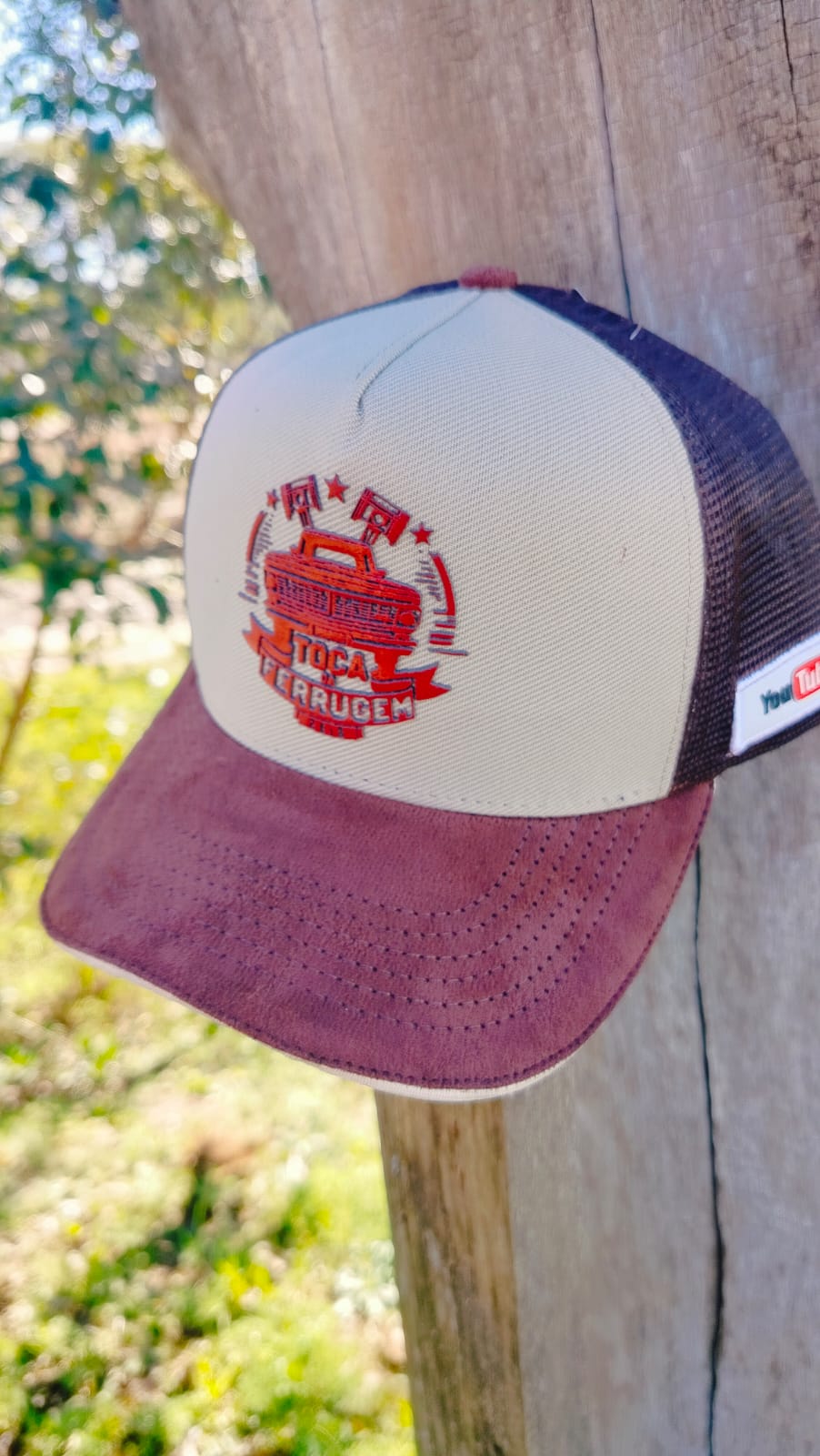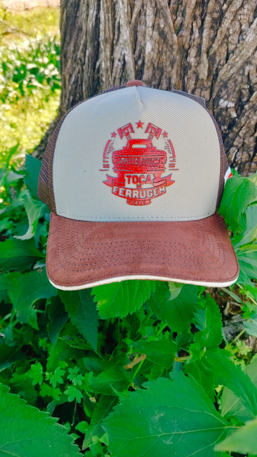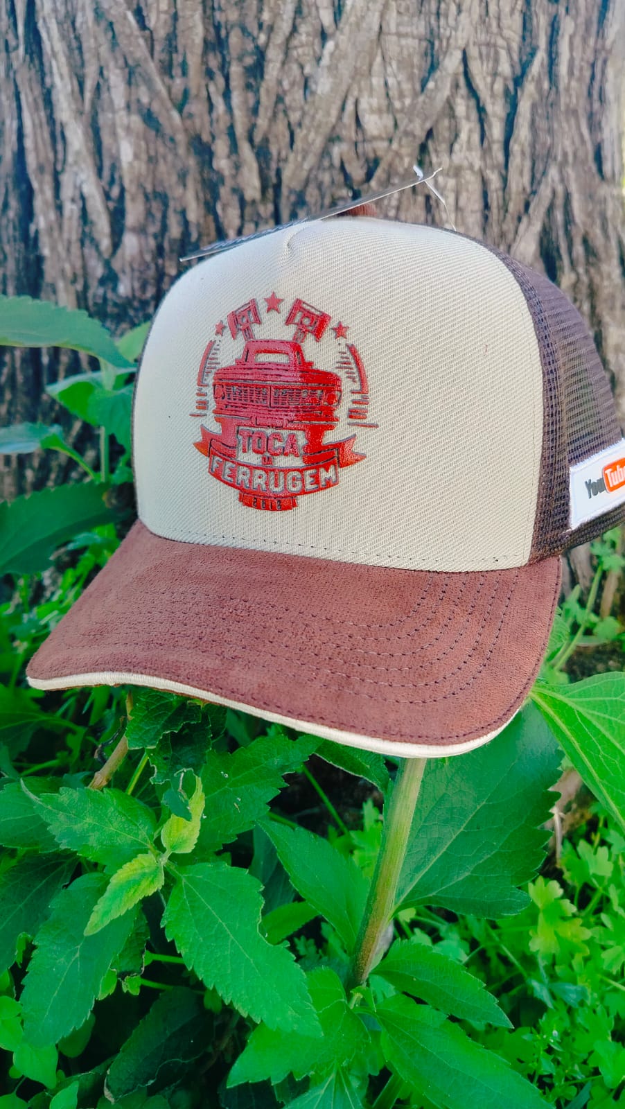 Olha que lindo esse boné da Toca da ferrugem com detalhes em couro e camurça.